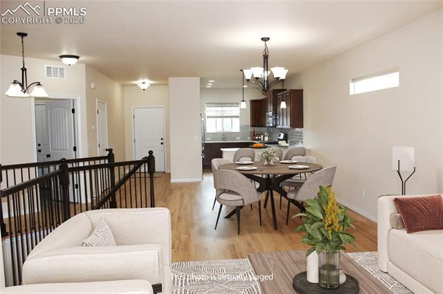 Welcome to this popular Vantage Homes Princeton Ranch, offering an open-concept great room design with 4 bedrooms, 3 bathrooms, and approximately 2,460 sq ft of beautifully finished living space, including the main level and basement. Built in 2017 and exceptionally maintained, this home is move-in ready and easy to show. Step inside to newly refinished natural oak hardwood flooring that carries through the entry, great living room,kitchen, and dining room. The upgraded kitchen features maple cabinetry, quartz countertops, a quartz breakfast bar, and stainless steel GE appliances—including refrigerator, dishwasher, microwave, and gas range. A modern stainless steel sink and faucet complete the space. The main-level primary suite includes a double vanity, walk-in shower, tile flooring, and a spacious walk-in closet. A convenient main-floor laundry room offers a deluxe stainless steel sink. The finished basement expands your living options with a large family/recreation room, two bedrooms, and a shared ¾ bath—perfect for guests, teens, or a home office setup. Enjoy year-round comfort with central air conditioning and ceiling fans throughout. The landscaped yard includes a sprinkler and drip system, concrete patio, and peaceful mountain views. Located just off Powers Blvd, this home offers quick access to schools, shopping, restaurants, and everyday conveniences.